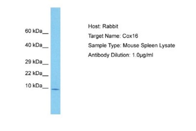 COX16 Polyclonal specifically detects COX16 in Mouse samples. It is validated for Western Blot.