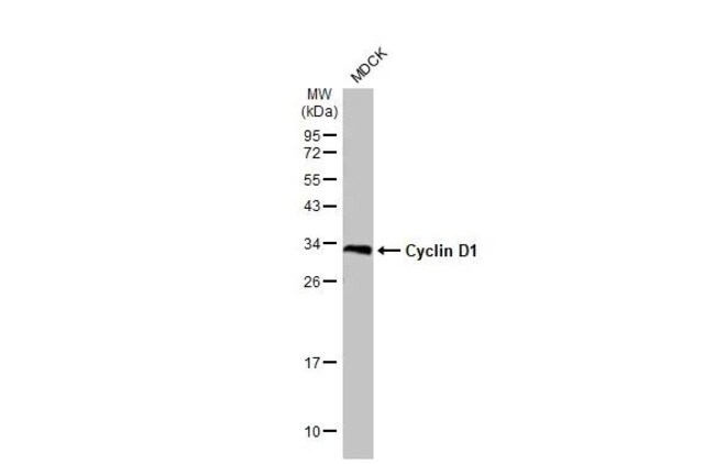 Cyclin D1 (PRAD-1, bcl-1) is one of the key cell cycle regulators, and functions in association with cdk4 and/or cdk6 by phosphorylating the Rb protein. Cyclin D1 is a putative proto-oncogene overexpressed in a wide variety of human neoplasms including mantle cell lymphomas (MCL). In addition, cyclin D1 positively regulates protein phosphorylation, mammary gland epithelial cell proliferation, and fat cell differentiation. In humans, the CCND1 gene encoding cyclin D1 is present on chromosome 11. Cyclin D1 is a cytoplasmic and nuclear protein that is synthesized during G1 phase and assembles with either cyclin-dependent kinase 4 (CDK4) or CDK6 in response to growth factor stimulation. D-type cyclin-CDK complexes act to inactivate the growth-suppressive function of the Rb protein through its phosphorylation, and titrate CDK inhibitors such as p21Cip1 and p27Kip1. Without growth factor-mediated stimulation, Cyclin D1 is unstable, and undergoes ubiquitin-mediated degradation, which is triggered by its phosphorylation. Cyclin D1 destabilization participates in G1/S phase arrest. The Cyclin D1 protein belongs to the highly conserved cyclin family, whose members are characterized by a dramatic periodicity in protein abundance throughout the cell cycle. Cyclins function as regulators of CDK kinases. Different cyclins exhibit distinct expression and degradation patterns which contribute to the temporal coordination of each mitotic event. Cyclin D1 forms a complex with and functions as a regulatory subunit of CDK4 or CDK6, whose activity is required for cell cycle G1/S transition. The Cyclin D1 protein has been shown to interact with tumor suppressor protein Rb and the expression of this gene is regulated positively by Rb. Mutations, amplification and overexpression of this gene, which alters cell cycle progression, are observed frequently in a variety of tumors and may contribute to tumorigenesis. Cyclin D1 has been successfully employed and is a promising tool for further studies in both cell cycle biology and cancer associated abnormalities.