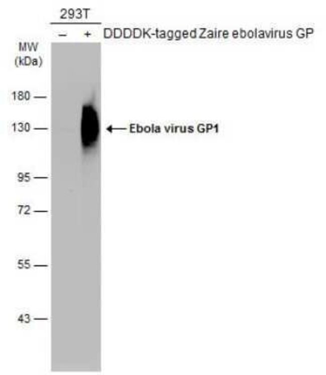 EBOV GP1 Polyclonal antibody specifically detects EBOV GP1 in Virus samples. It is validated for Western Blot, Immunofluorescence