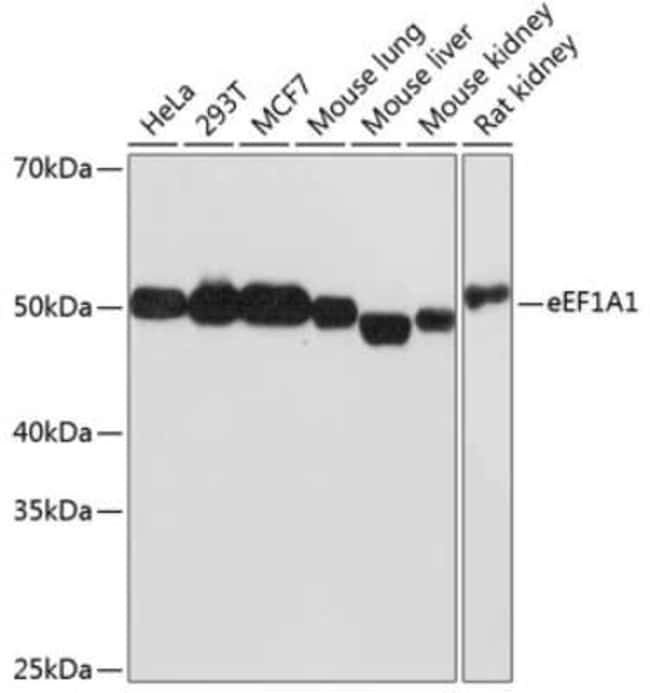 eEF1A1 Monoclonal antibody specifically detects eEF1A1 in Human, Mouse, Rat samples. It is validated for Western Blot, Immunofluorescence