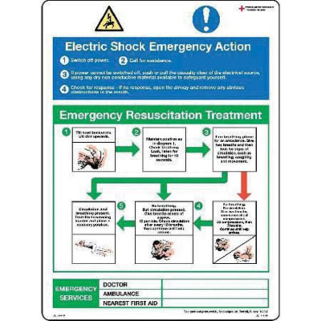Manutan Electric shock emergency action sign. 450 x 600mm.Sa vinyl