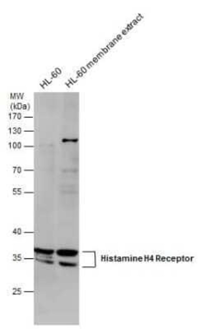 Histamine H4R Polyclonal antibody specifically detects Histamine H4R in Human samples. It is validated for Western Blot