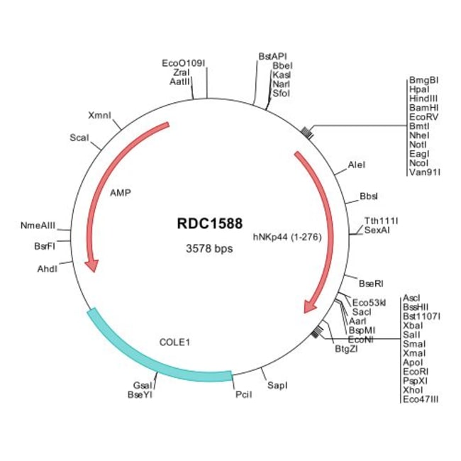 This shuttle vector contains the complete ORF for the gene of interest, along with a Kozak consensus sequence for optimal translation initiation. It is inserted NotI to AscI. The gene insert is flanked with convenient multiple cloning sites which can be used to easily cut and transfer the gene cassette into your desired expression vector.
