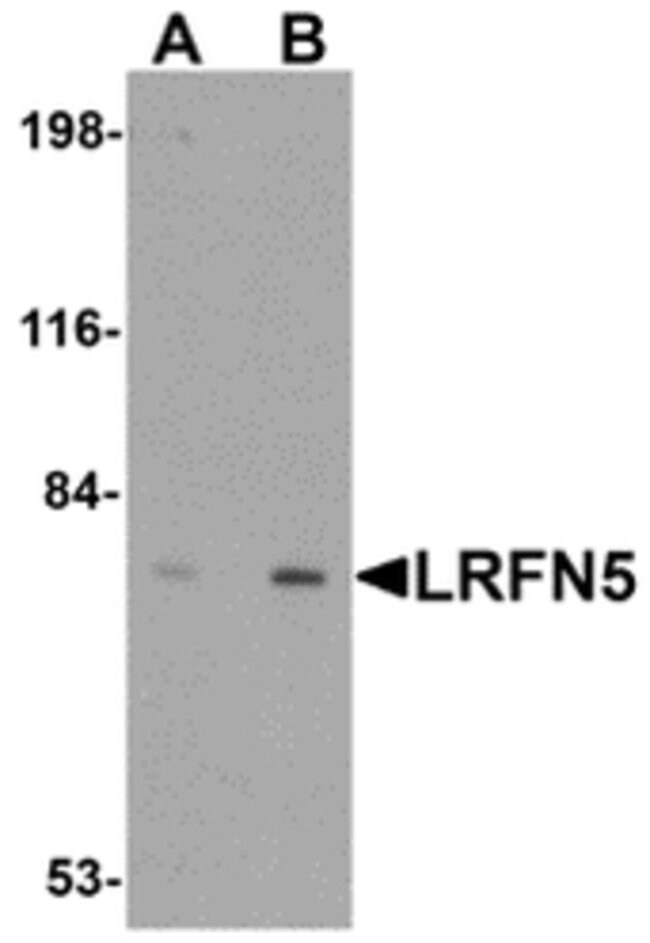 LRFN5 is one of a family of five transmembrane glycoproteins that are highly expressed in neuronal tissues. LRFN proteins share leucine-rich repeat (LRR)-immunoglobulin-like (Ig)-fibronectin type III (Fn)-transmembrane domain structure with other members of the LRR-Ig-Fn protein superfamily such as the Slitrk family of proteins. Expression of LRFN1, -3, and -4 mRNA was detected in embryonic neuronal cells, while LRFN2 and LRFN5 expression was primarily restricted to more mature cells. LRFN1, -2, and -4 bound to PDZ domains of postsynaptic PSD95, re-distributing PSD95 to the cell periphery. It has been suggested that the Lrfn proteins play a role in the developing and/or mature vertebrate nervous system.
