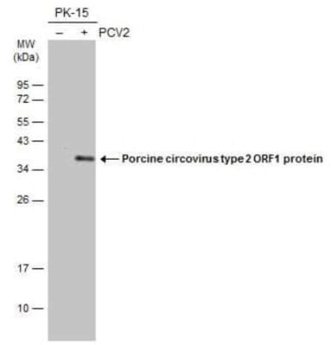 Porcine Circovirus 2 Replicase Polyclonal antibody specifically detects Porcine Circovirus 2 Replicase in Virus samples. It is validated for Western Blot, Immunohistochemistry, Immunofluorescence
