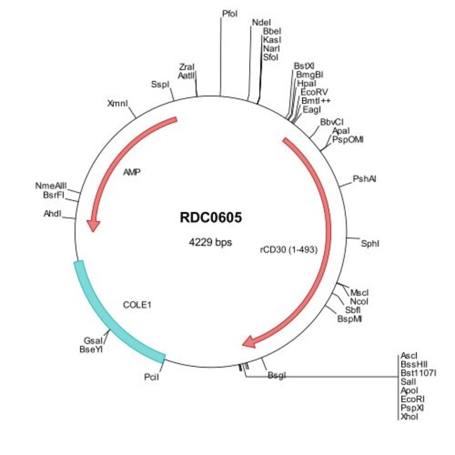 The Rat CD30/TNFRSF8 (EDL81069) VersaClone cDNA clone contains the complete ORF for CD30/TNFRSF8, along with a Kozak consensus sequence for optimal translation initiation. The gene insert is flanked with convenient multiple cloning sites which can be used to easily cut and transfer the gene cassette into your desired expression vector. The CD30/TNFRSF8 insert is sequence verified and the entire plasmid DNA and insert translated sequences are provided.