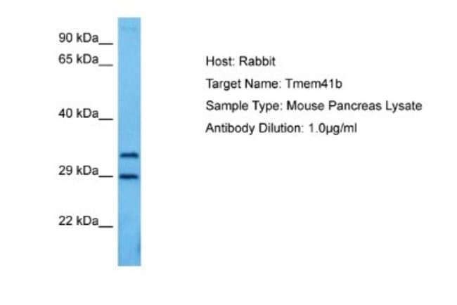 TMEM41B Polyclonal specifically detects TMEM41B in Mouse samples. It is validated for Western Blot.