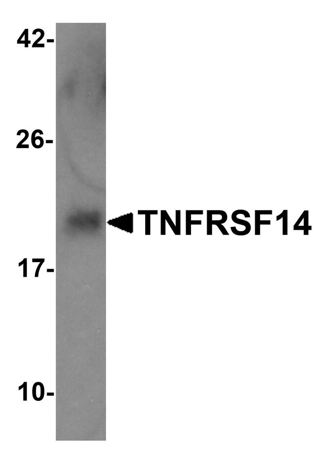 TNFRSF14 is a member of the TNF-receptor superfamily. TNFRSF14 was identified as a cellular mediator of herpes simplex virus (HSV) entry. Binding of HSV viral envelope glycoprotein D (gD) to TNFRSF14 has been shown to be part of the viral entry mechanism. The cytoplasmic region of TNFRSF14 was found to bind to several TRAF family members, which may mediate the signal transduction pathways that activate the immune response. Activation of the signal transduction pathway involving TNFRSF14 in T cells stimulates T cell proliferation and cytokine production, leading to inflammation and enhanced CTL-mediated tumor immunity, suggesting that these proteins may be useful as potential targets for controlling cellular immune responses. Multiple alternatively spliced transcript variants have been described, but the full-length nature of some of these TNFRSF14 variants have not been determined.