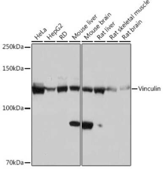 Vinculin Monoclonal antibody specifically detects Vinculin in Human, Mouse, Rat samples. It is validated for Western Blot, Immunohistochemistry, Immunoprecipitation, Immunohistochemistry (Paraffin)