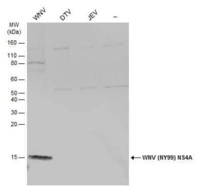 West Nile Virus NS4A Polyclonal antibody specifically detects West Nile Virus NS4A in Virus samples. It is validated for Western Blot